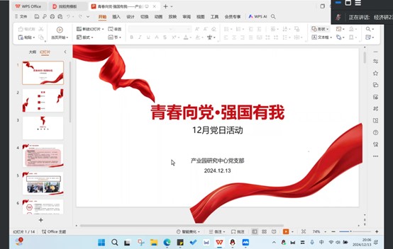 为进一步学习贯彻党的二十届三中全会精神,充分感受新中国成立75周年的伟大成就,培养学生党员爱国情怀,产业园研究中心党支部于12月13日在腾讯会议召开“青春向党,强国有我”主题党日活动,本次会议由党支部书记霍晓坤同志主持,全体党员积极参与。