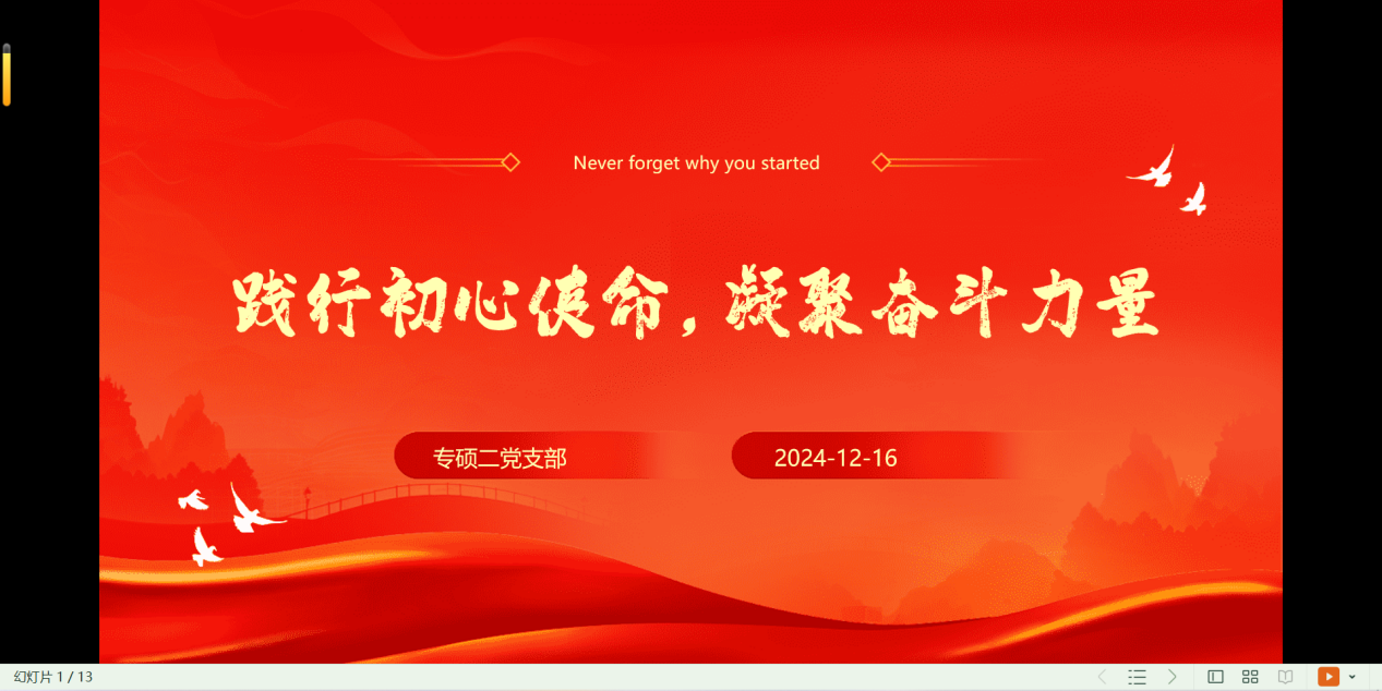 为积极响应党的号召,深入贯彻落实二十大精神,专硕二党支部于12月16日晚7点,通过腾讯会议召开了以“践行初心使命,凝聚奋斗力量”为主题的党日活动。此次活动旨在通过重温党的光辉历程,学习党的先进理论,进一步激发党员的责任感与使命感,凝聚起为实现中华民族伟大复兴而努力奋斗的磅礴力量。