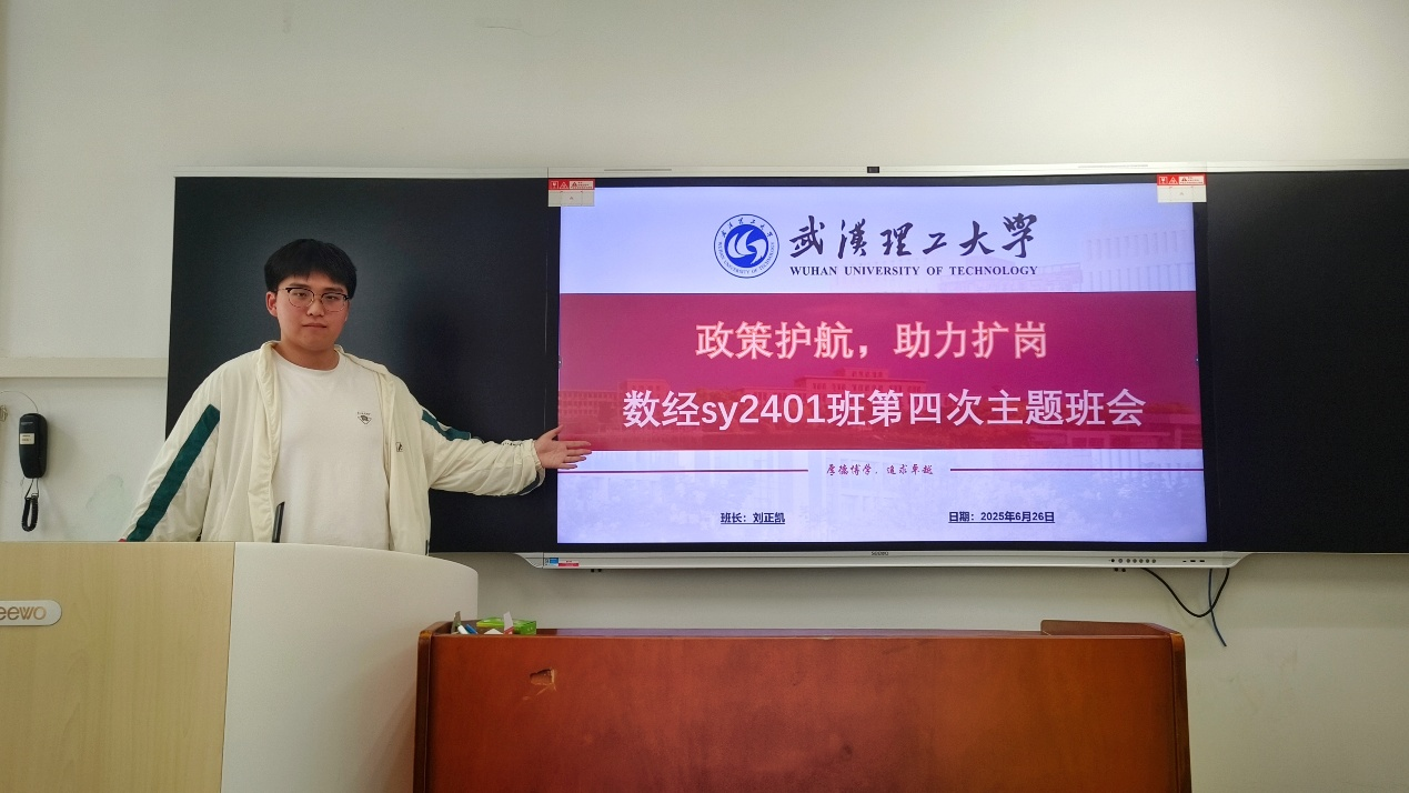 为帮助同学们深入了解国家就业政策、明确职业方向、提升就业能力,数经sy2401班于2025年6月26日在博学西楼116教室成功举办了以“政策护航 加力扩岗”为主题的班会。本次班会紧扣“政策护航 加力扩岗”这一核心议题,由班长刘正凯同学主持,全体同学踊跃参与。